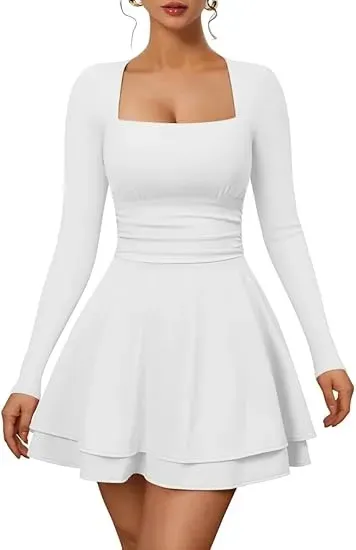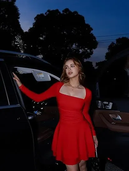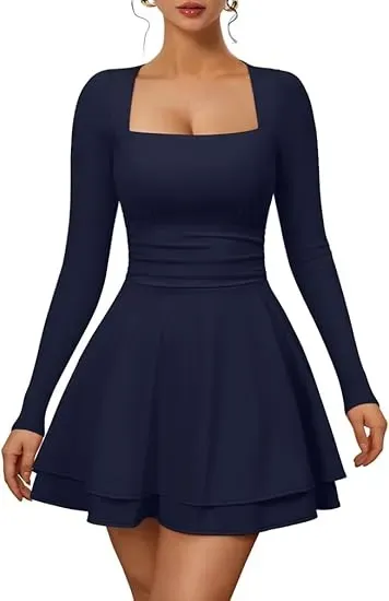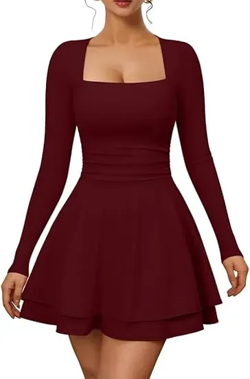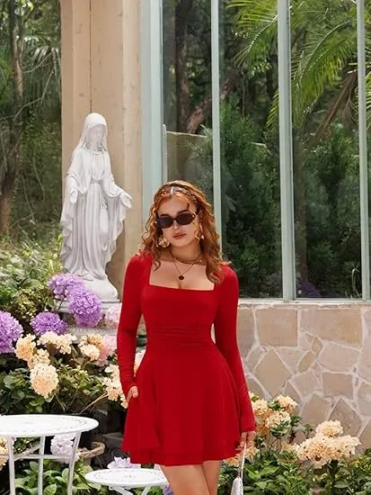 Slim Silhouette and Ruched Waist Design: This square-neck, long-sleeved mini dress features a flattering slim cut and a cleverly ruched waist design that effortlessly accentuates your curves and flatters your figure, while adding subtle texture to the overall look.
