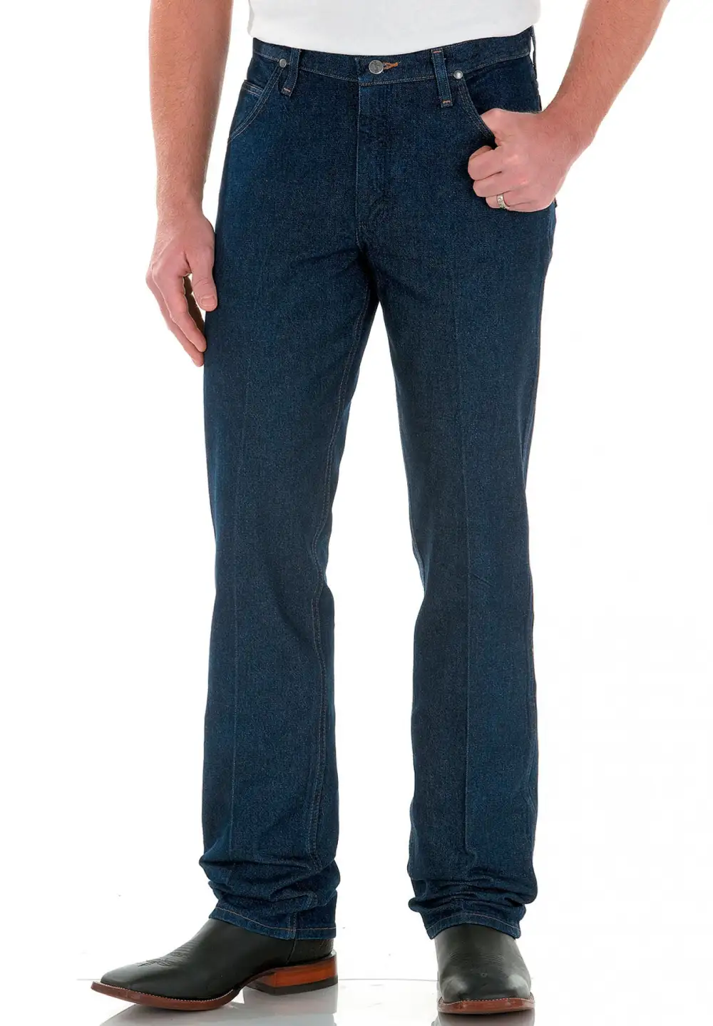 Wrangler® cowboy cut five-pocket jeans have a great slim fit and go perfectly over boots. Made with two front and two back pockets plus a coin pocket to hold your phone, wallet, keys, and small essentials.